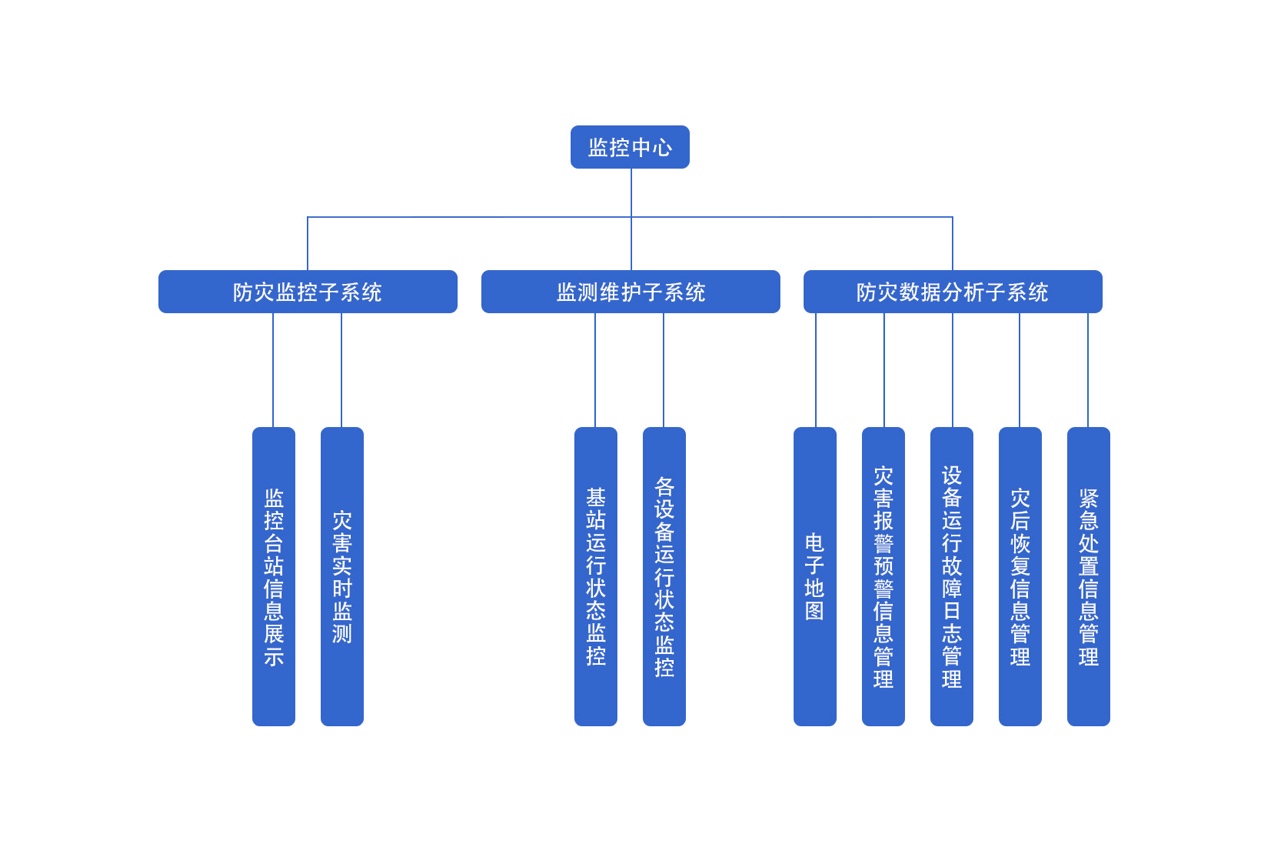 監(jiān)控中心能夠?qū)Ψ罏?zāi)監(jiān)測區(qū)域內(nèi)進行全方位的災(zāi)害監(jiān)測及預(yù)警,對各個監(jiān)測設(shè)備進行全方位、多層次的監(jiān)控和管理。對監(jiān)控設(shè)備運行狀態(tài)實時監(jiān)測,同時對接收到的報警、預(yù)警信息進行展示,實現(xiàn)電子地圖自動定位、多點災(zāi)害預(yù)測定位,自動化災(zāi)害緊急處置、設(shè)備故障日志查詢、災(zāi)害報警預(yù)警數(shù)據(jù)查詢導(dǎo)出、實時監(jiān)測等功能。